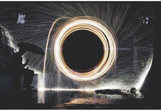 Into the Vortex, A rabbit hole, fallen… A coordinate in time, not birth, but t=0; No bang, just collapse! Into a black hole, Your mouth at the centre of our vortex.